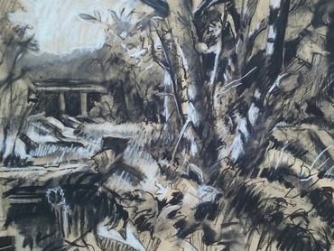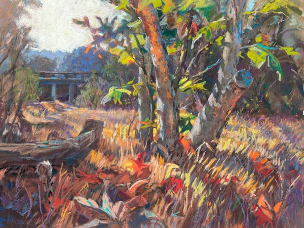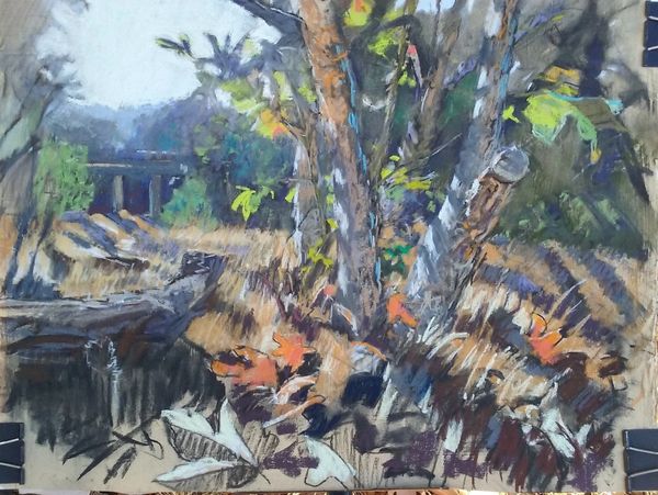 The foreground is more developed with lights in the shadows, foliage in trees intensified, accent colors in fallen leaves. Resolve problem areas, begin using soft pastels.